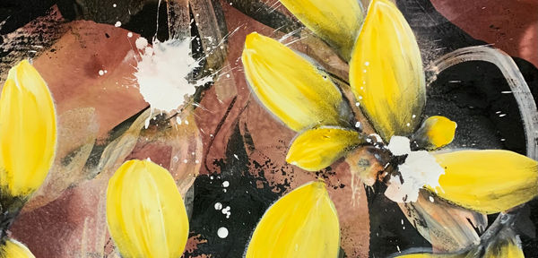 Im gedanklichen Streifzug durch die Natur entwickeln sich eigene Blütenformen auf einem zuvor gestalteten abstrakten Untergrund. Ohne vorgefertigte Skizzen entfalten die Blüten ihren individuellen Charakter und setzen sich frei sowie intuitiv auf der Fläche durch.
